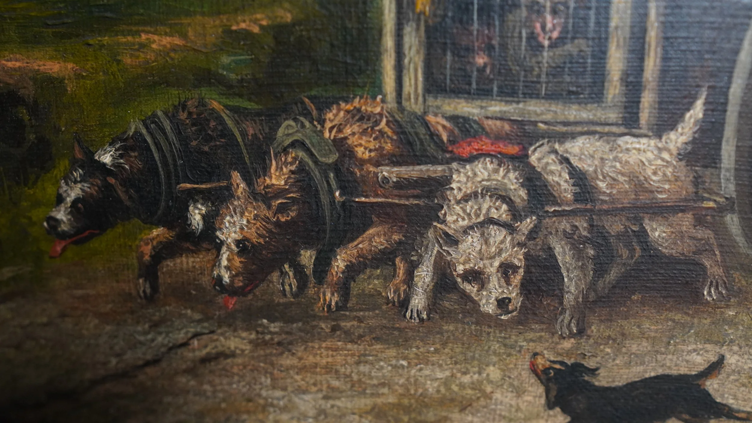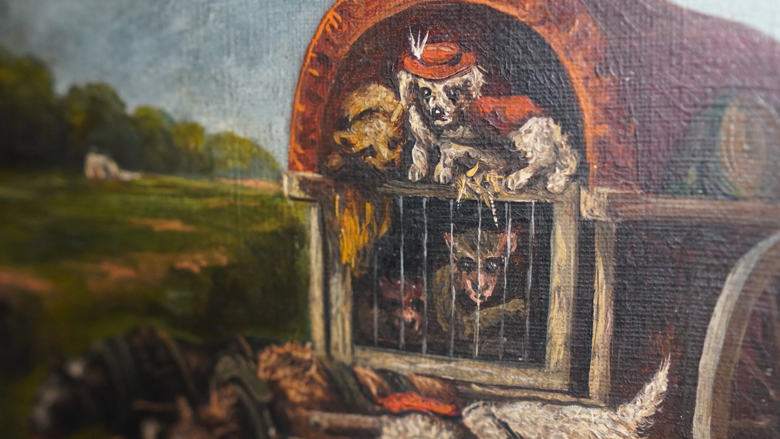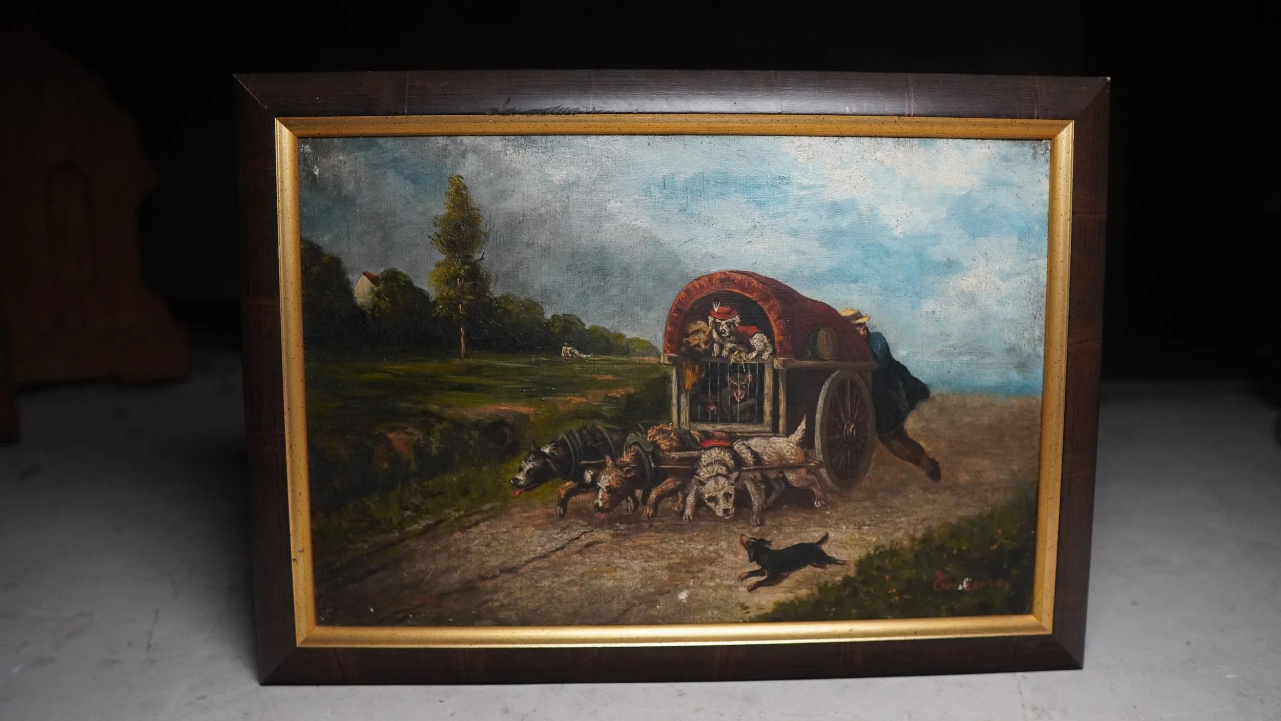 Antique Oil painting Features a caravan being pulled up dogs and a monkey on board