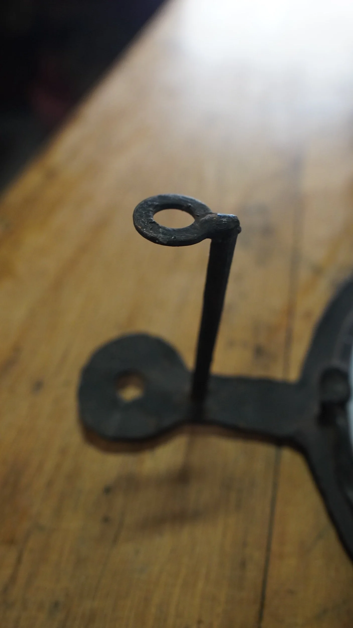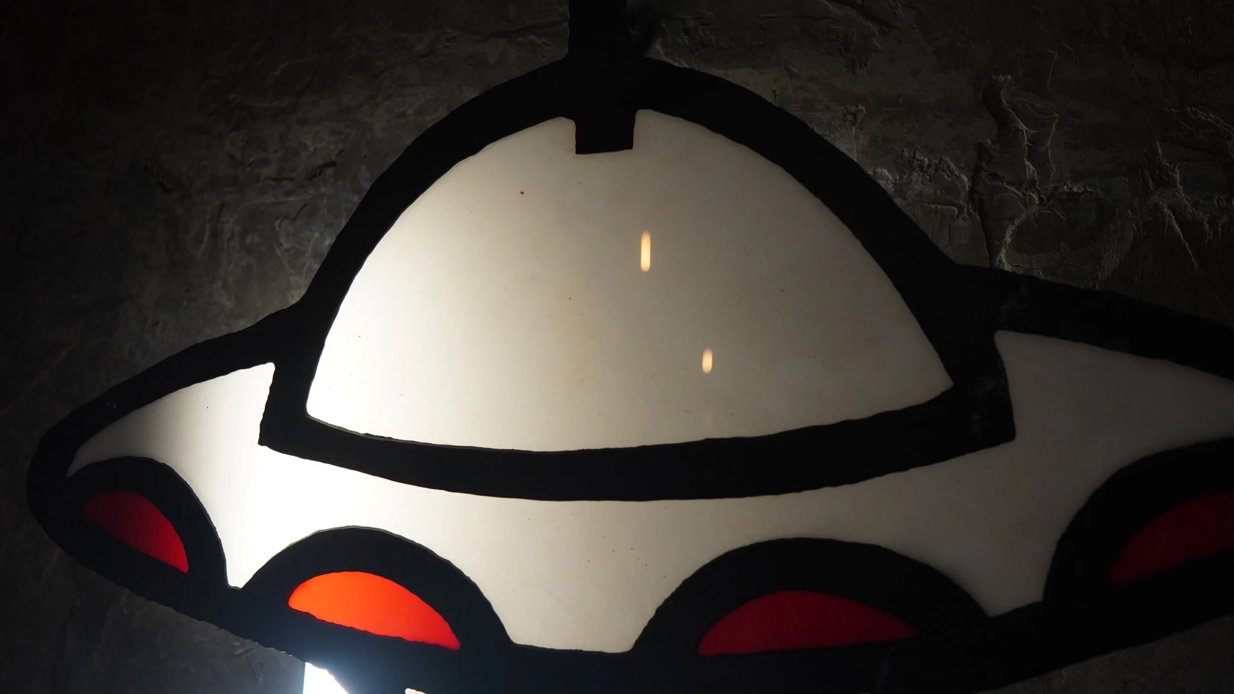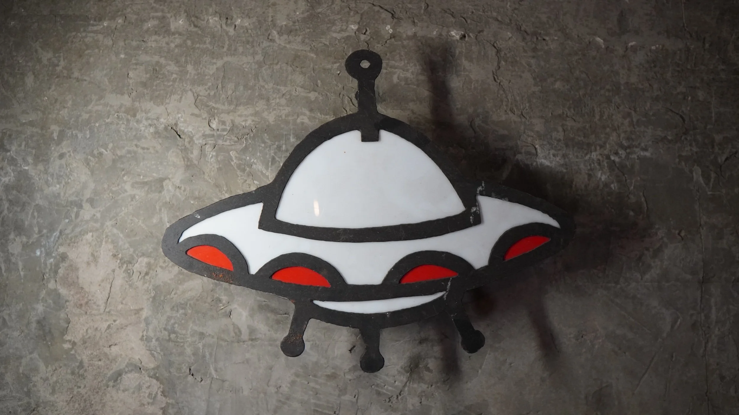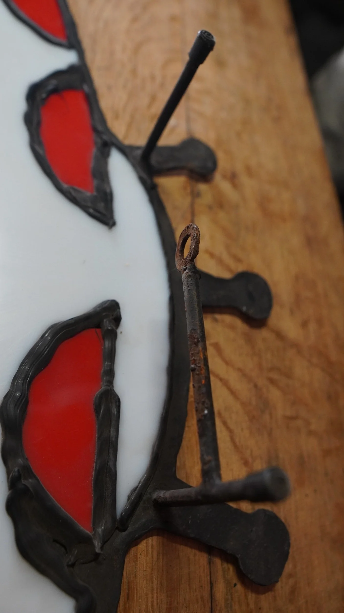 Constructed with iron and fiberglass, this art piece was made to sit out from a wall and have a light behind