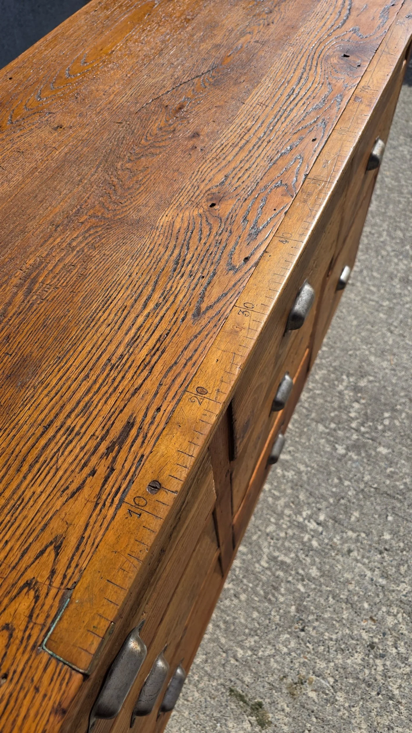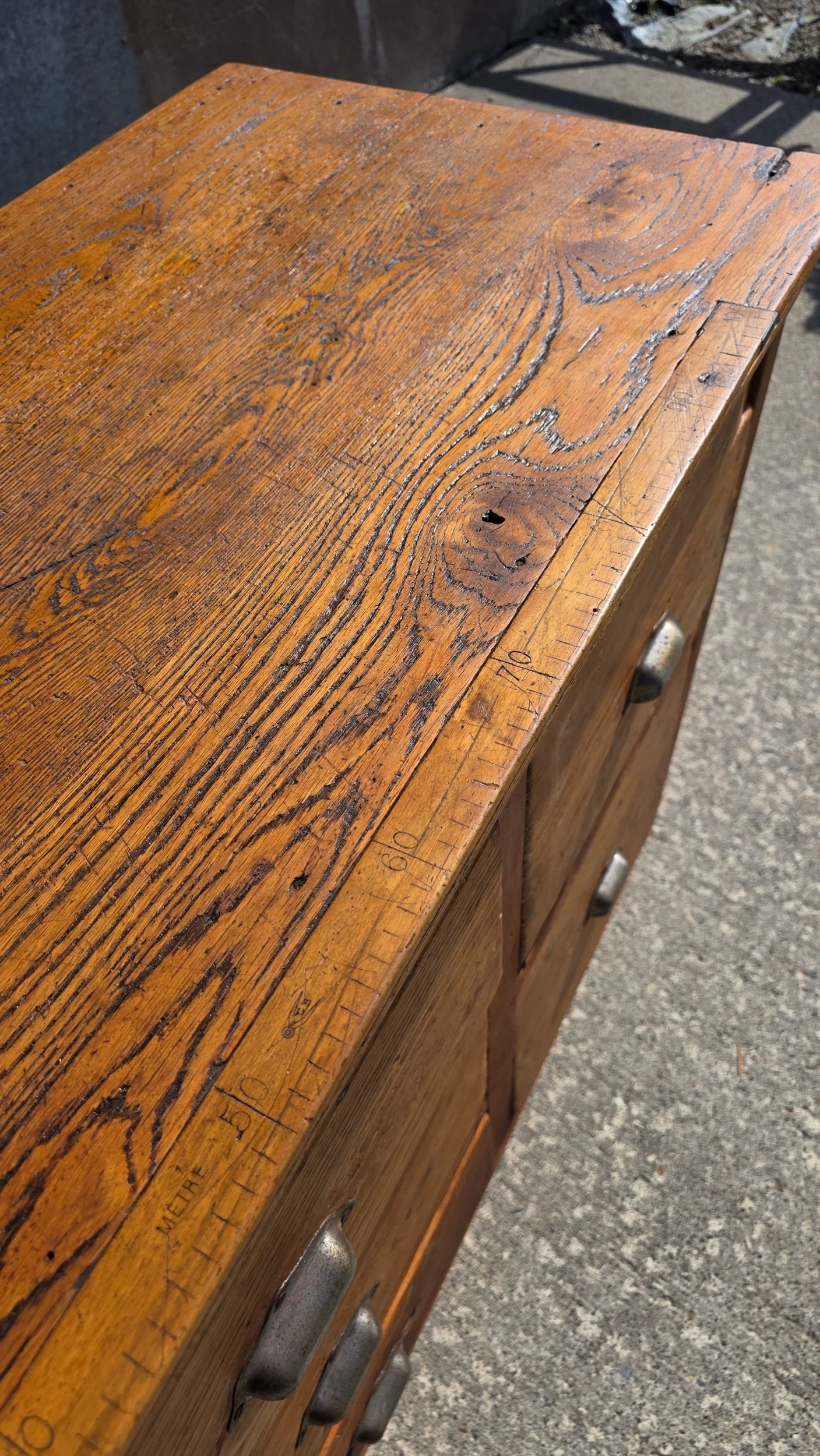 Gorgeous antique dress makers drawer unit. Complete with an inlaid measuring stick built into the top for measuring and cutting fabric.